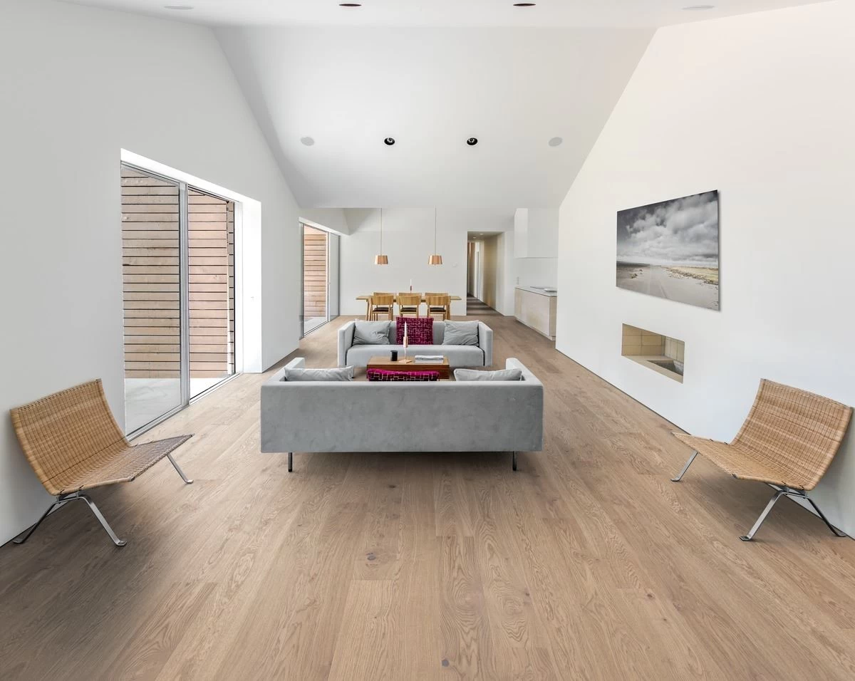 Kahrs Oak Coast has been finished with an ultra-matt lacquer, which makes the boards look raw and untreated, whilst also offering protection from daily wear. Each bevelled plank features a rustic grain which combines soothing earthy tones with grey features and knots appearing through a light stain. All these features combine for a relaxing, homely feel which is versatile enough to be used in most styles of interior design.